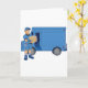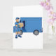 Este design é um entregador e uma van. A carrinha de entrega é azul e o entregador está em frente a uma caixa de carregando para entrega. Este entregador e van design parecem excelentes