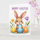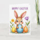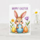 The front design shows a cute, human-like bunny with long ears, light brown fur, and big blue eyes, holding a large blue egg close as if it’s a sweet gift from a friend 🐰. Its rosy cheeks, small lashes, and gentle smile add a tender, affectionate look to the scene. The background stays white, so the soft colors of the bunny and eggs stand out without feeling busy. To the left sits a bright yellow daisy-like flower, and to the right a purple tulip-like bloom, with a few tiny pink sprigs nearby 🌷. At the bunny’s feet, a golden yellow egg and an orange egg rest in short green grass, each dotted with small speckles. The message “HOPPY EASTER” appears near the top in purple, with the letters arranged in a smooth, flowing style that arches lightly over the character. The large blue egg has scattered white speckles across its surface, and the purple tulip-like flower shows a darker center and curved petals.