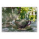 Uma pintura encantadora. Hora do chá no jardim. Uma xícara de chá se senta ao lado de um bule de chá prateado em uma toalha de mesa. A sombra pregada de uma árvore próxima a torna convidativa. Um cartão perfeito para qualquer ocasião. A pintura original é de apenas 7" x 5"