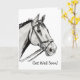 Em breve, faça uma carta para a pessoa da cavalaria. A carta retrata o desenho de tinta da cabeça de um cavalo com a mensagem Get Good Logo! Mensagem dentro diz "Espero que em breve volte à sela". Todo texto é modelo e pode ser facilmente personalizado.