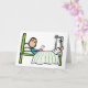 O design do Hospital Bed mostra o adesivo lendo um cartão enquanto deitado na cama. Tem uma perna quebrada em um molde assinado, erguido por equipamento especial. O paciente tem travesseiros confortáveis e uma atitude relaxada e resignada com uma estadia no hospital. Vai logo!