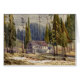Pintura da aguarela de um hotel de três andares e dos anexo cercados pela sequóia vermelha e outras árvores em Calaveras County, Califórnia.
