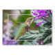 Um cartão de posto com uma imagem aproximada de um beija-flor alimentando-se de uma linda flor roxa.