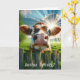 Uma curiosa vaca em cima de uma cerca de madeira sob o sol radiante, com raios a passar por um céu parcialmente nublado. Todo o texto pode ser mudado.