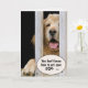 Ouro Retriever cão a espreitar através da grade do pavimento de madeira por ter mais humor de aniversário. O texto é editável.