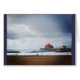 Uma manhã de inverno tempestuosa em Huntington Beach, sul da Califórnia. Vista do Diner da Ruby no final do píer, a sombra da Ilha Catalina à distância, e ondas grandes que fazem deste um ponto de surfe popular.