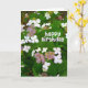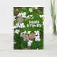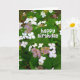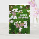 Um design de cartão de aniversário com uma foto de um dos tipos menos comuns de Hydrangea, Hydrangea Aspera, que tem esses maravilhosos desenhos quase como flores. Feliz aniversário é escrito em uma espécie de fonte em estilo de desenho animado sutilmente sombreado para corresponder às cores das flores.