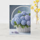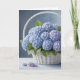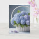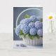 Um cesto branco mais grosso cheio de hidrâncias azuis e roxas vibrantes repousa sobre uma superfície com flores adicionais sobre a mesa Todo o texto pode ser alterado.