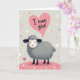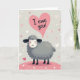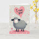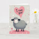 This Valentine's Day card shows a cute cartoon sheep filling the lower half of the front. Its wool is dark gray and fluffy, and its face is a light cream color with big dark eyes and a small, shy smile. The sheep has a soft blush on its cheeks, which makes it look sweet and a little bashful. Above its head, there’s a large pink heart shaped like a speech bubble with the words “I ewe you!” inside. The text looks like casual handwriting in a dark color and sits centered in the heart. The background is light gray with small hearts scattered around in white and pale pink, and a few look slightly sparkly. The sheep stands on a curved pale pink hill, giving the whole scene a gentle, loving feel 💘❤️, perfect for sharing Valentine’s Day sentiments.