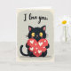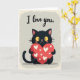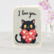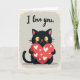 This card shows a fluffy black cat sitting in the center, facing forward with big yellow eyes that look sweet and sincere. The cat has a tiny pink blush on its cheeks and a calm, shy expression. It’s holding a large red heart close to its chest, and the heart is dotted with small white hearts for extra love. The background is a soft beige-gray with light cream polka dots, and the edges look slightly worn, like a handmade print. At the top, the words “I love you” appear in a flowing handwritten script, standing out clearly against the lighter background. The whole scene feels warm and comforting, like a simple note you’d want to keep ❤️💌.