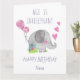 Cartão de aniversário bonito e engraçado, intitulado "A idade é irrelefante". Design apresenta uma ilustração caprichosa de um elefante com balões de aniversário, corações amorosos e flores. Você pode personalizar o cartão para qualquer pessoa que quiser na frente e também pode escrever seu próprio dentro de mensagem.