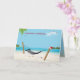 Praia tropical com hammock e chapéu de Papai Noel em areia com estrelas de Natal.