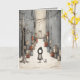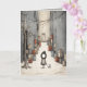 Ilustração desenhada à mão de uma garotinha e de um cão num cheio de beco com apresentações de Natal