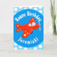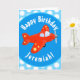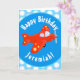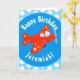Este feliz avião vermelho está voando para uma festa! Desenhado no estilo de ilustração de desenho animado em um fundo azul para uma celebração divertida!