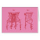 Uma ilustração antiga de uma patente de corset colorida em rosa enfeita essas t-shirts e outros itens.