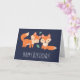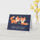 Cartão de aniversário com uma ilustração gráfica de 2 raposas de laranja bonitinhas e felizes. Mensagem na dentro que você pode personalizar. Fundo azul escuro.