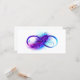 Símbolo infinito com uma bela pena pintada em cores roxas e azuis brilhantes sobre fundo branco.