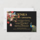 Um arranjo botânico floral mestre holandês elegante e dramático contra um fundo escuro, com Pormenores de Casamento e Cartão de Informação. Convidado de casamento. Bonitas rosas, íris, peônias e tulipas em cores rosa, vermelha, azul e amarela.