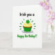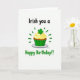 This greeting card features a digital illustration of a cupcake centered on a wide white background, giving the design lots of airy space. Across the top, the phrase “Irish you a Happy Birthday” appears in black text, and the remaining words continue along the bottom in emerald green, framing the cupcake like a friendly note passed between close friends 💚. The cupcake sits in a green wrapper with light stripes, and its soft yellow frosting curls upward in a generous swirl that feels sweet and inviting. A bright green shamrock rests on top, adding a cozy St. Patrick’s Day touch ☘️. Short green dashed lines radiate around the cupcake, like little sparks that draw your eye back to the center. Near the lower area, a small “Jossie” signature is tucked in discreetly without pulling focus. The green accents repeat in the wrapper, shamrock, and dashed rays, while the black-and-green lettering stays crisp against the white space.
