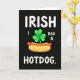 This design shows a black background with large white text reading “IRISH I HAD A HOTDOG,” arranged in a centered stack that feels like a cheeky note shared between friends on St. Patrick’s Day 💚. In the word “IRISH,” a bright emerald shamrock replaces the “SH,” its soft highlights making it look gently lit, like a lucky charm slipped into the message ☘️. The clover sits right in the middle of the top line, drawing your eye the way a knowing glance does when two people share the same joke. Beneath the text, a cartoon hotdog rests front and center, with a red sausage tucked into a warm golden-brown bun. A wavy stripe of yellow mustard zigzags across the top, adding a cozy, craveable detail that feels like an easy date-night snack. The spacing around each element keeps the joke easy to read, with the white letters standing out sharply against the dark background. The overall layout stays simple and focused, with the shamrock acting as the visual bridge between the wordplay above and the hotdog below. The mustard line curves in three loose waves from left to right across the sausage.