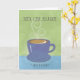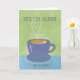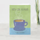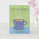 Este cartão de aniversário da Irmã apresenta uma xícara de café quente e a vapor com espirais de vapor e espuma. A taça e o disco são roxos sobre um fundo azul claro e verde kiwi com efeito de aquarela. Típico fino e moderno para o sentimento frontal. A maneira perfeita de dizer que a ama "um latte".