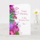 Esta imagem apresenta um design floral vibrante e decorativo. Inclui vários tons de flores roxas, cor-de-rosa e verdes e folhagem, com detalhamento intrincado. As flores aparecem em camadas, criando uma textura rica e luxuosa. Há bagas pequenas e sotaques estilizados, como brilho em alguns dos elementos, dando a ela um toque caprichoso e artístico. Pode ser personalizado com o nome.