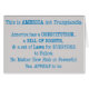 Em texto azul lê-se: "Isto é a América, não Trumplândia. A América tem uma Constituição, uma Declaração de Direitos, e um conjunto de leis para todos seguirem, não importa quão rico ou poderoso você pareça ser."
