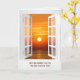 Cartão janela branca aberta com simpatia pela cena do sol