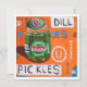 Impressão de arte de um vidro de picles com fundo e texto laranja.