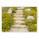 Jardim de aquarelas com flores amarelas nas escadas de flores e pedras