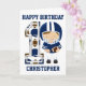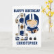 Perfeito para o futuro fã de futebol que celebra o seu primeiro aniversario, apresentando uma ilustração de um jogador de futebol numa camisa de futebol azul e branca e capacete de ferro grelha. Ele está ao lado de um grande número um com um padrão de bolas de futebol e capacetes a dentro em uma cor azul coordenadora. Personalize o texto na frente e a dentro do cartão para criar um cartão de aniversário exclusivo e personalizado para o aniversariante. Se você quiser este design com um número ou combinação de cores diferentes, entre em contato conosco através da nossa loja CelebrationBazaar.