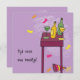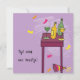 kaart met uitnodiging voor feest. afbeelding van tafeltje met flessen en glazen kleur lila. Tekst kan aangepast worden.