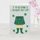 This card shows a light grey background with the lower half of a figure centered, dressed in a green tartan kilt with clear plaid lines and a small pouch detail at the front. Bare legs extend down into emerald green rain boots, and the cheeky outfit pairing feels like an inside joke you’d share with a close friend 💚. Across the top, the phrase “IF ME KILT OFFENDS YE I CAN ALWAYS TAKE IT OFF!” sits in a chunky, hand-drawn green font that stretches wide and grabs attention. The letters look slightly uneven in a natural way, like a quick note meant to tease someone you like without being mean. Small four-leaf clovers are sprinkled around the figure, echoing the green tones and adding a flirty wink of good luck ☘️. The palette stays mostly greens against the pale grey, keeping the focus on the kilt, boots, and headline. Several clovers float near the sides and corners, framing the central legs and leaving open space around the top text.