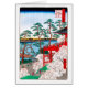 Utagawa Hiroshige (1797 - 12 de outubro de 1858) era um artista ukiyo-e japonês, e um dos últimos artistas excelentes dessa tradição. A lenda diz que Hiroshige decidiu se tornar um artista ukiyo-e quando viu os impressões de seu contemporâneo, Hokusai. (Hokusai publicou algumas de suas maiores impressões, como Trinta e seis visualizações do Monte Fuji, em 1832 — o ano em que Hiroshige se dedicou ao cheio da sua arte.) Desde então até a morte de Hokusai em 1849, suas obras paisagísticas competiam pelos mesmos clientes. A Hall de Kiyomizu, no Parque Ueno, foi fundada em 1631 como parte de um ambicioso plano para estabelecer um complexo de templo budista excelente em Edo e para fornecer defesa espiritual do Nordeste, rumo a partir do qual se pensava que virariam os espíritos mau. O salão é celebrado pelas flores de cereja nas suas proximidades e pela visão que oferece. Mas mesmo no dia de Hiroshige o panorama real era menos espetacular do que sugere essa impressão, que exagera a largura da varanda se estendendo do templo e mostra os pinheiros como gigantes torrenciais. Vintage, linda e colorida paisagem natural asiática, belas artes.