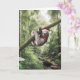Uma preguiça vestindo um chapéu de Papai Noel vermelho e branco e um cachecol vermelho pendura confortavelmente de um galho no meio de uma floresta verde e luxuosa