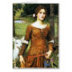 Agrupamento especial da pintura John William Waterhouse de Lady Clare. Trabalho de arte representa uma jovem que lidera um veado branco nas matas. A pintura é do século XIX.