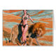 Renderização digital em 3D de uma linda jovem e de um leão no fundo da paisagem desértica