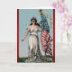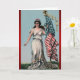 Cartão de saudação de 5" x 7" com uma imagem vintage de Lady Liberty parada sobre grama verde em um longo e fluente vestido branco, segurando uma bandeira americana em sua mão esquerda com uma final de águia balda americana dourada. "Com um verdadeiro espírito nacional de coragem, integridade, sacrifício, liberdade e independência, desejo-lhe um Feliz Dia da Independência." Veja confetti correspondente, adesivo redondo, adesivo retangular e papel de embalagem. Veja toda a coleção do Cartão Saudação do Dia de Independência na categoria CARDS & STICKERS na seção HOLIDAYS.