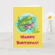 Um cartão do aniversário com uma ilustração bonito de um lagarto tropical verde cercado pelas folhas e pelas flores em uma cor do azul de turquesa.