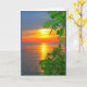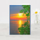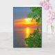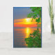 Uma fotografia de um pôr do sol laranja, amarelo e azul, emoldurada por ramos verdes brilhantes, é o tema do meu cartão "Lake Winnebago Sunset Thinking Of You". Eu capturei esta cena ao longo da orla costeira do lago Lindo Winnebago em Quinney, Wisconsin.