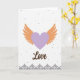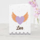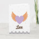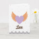 This greeting card features a large heart in a soft lavender shade at the center, flanked by two peach-toned wings that open outward like a gentle embrace ❤️. Beneath the heart, the word “Love” appears in a flowing brown lettering style, centered and easy to spot. The background is white with a faint texture, sprinkled with small gray dots that feel like quiet confetti floating around the design. The wings and heart sit close together, creating a cozy, romantic closeness as if the symbol is being carefully carried upward. Along the lower portion, a detailed gray border with lace-like curls adds a classic, delicate touch without overpowering the main image 🌼. The overall palette stays soft and calm, mixing pastel lavender and peach with grounded brown and gray accents. A neat gray ornamental trim runs across the bottom edge, with tiny curled details repeating like filigree.