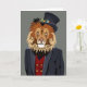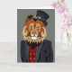 Esta design apresenta o retrato de um leão no fato e chapéu de um homem.