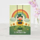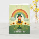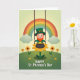 This card shows a smiling leprechaun with a fiery red beard, dressed in a green coat and tall green hat with a gold buckle, swinging on a huge yellow flower like a swing seat. Two ropes drop from above to hold the flower, and his relaxed posture and friendly grin feel like he’s sharing a private joke with someone watching. Behind him, a big rainbow 🌈 arches across the sky, with soft gray clouds floating underneath it. Next to the flower swing sits a shiny black pot packed with gold coins, and a few more coins are sprinkled across the green ground like little surprises. The rolling landscape is a rich green 💚 with small orange and yellow flowers dotted here and there. Along the bottom, the phrase “HAPPY ST. PATRICK’S DAY” appears in white, set wide across the base so it stands out against the green. The rainbow bands are clearly layered from red through violet, curving above the leprechaun and the coin-filled pot.