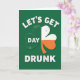 Designed with a deep emerald green background, this St. Patrick’s Day card centers on a three-leaf shamrock that feels like it’s leaning in close, as if inviting friends to gather shoulder to shoulder. The left leaf stays green, while the right side of the clover fills with crisp white and warm orange, echoing the Irish tricolor against the green field ☘️. Across the top, “LET’S GET” curves above the shamrock in worn white lettering, setting up the message like a header. The word “DAY” sits inside the left leaf, tucked neatly into the shape as if it belongs there. “DRUNK” stretches along the bottom in the same weathered white, grounding the layout and balancing the curved text above. A distressed, speckled texture runs through both the letters and the clover, with faded edges and tiny breaks that make the print look aged and well-loved 💚. The shamrock’s white-and-orange section sits on the rightmost leaves, while “DAY” remains framed inside the green left leaf.