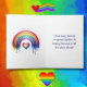 Um cartão de aniversário feliz sentimental para um casal gay. Ilustração LGBTQIA+ de dois homens se abraçando. Dentro é um arco-íris e coração. Todo o texto no cartão pode ser personalizado na área de personalização.