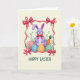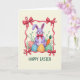 Designed with a plump lilac rabbit 🐰 at the center, the illustration uses soft rounded shapes and a small upturned smile that feels like a gentle hello to someone close. A tiny crimson bow tie sits at the rabbit’s neck, adding a sweet, dressed-up touch that reads like affection in visual form. A fuchsia ribbon curves around the scene as a border, with neatly tied bows placed at each corner like a wrapped gift. At the rabbit’s feet, four decorated eggs in turquoise, yellow, pink, and mint green sit together, each topped with small white polka dots that suggest a shared little secret between friends. Behind the eggs, emerald leaves rise in simple, airy shapes, bringing in an early-spring setting 🌷. Tucked among the greenery is a single orange root vegetable with leafy tops, adding a cozy garden detail. Near the bottom, the words “HAPPY EASTER” are centered in deep green lettering beneath the illustration on a creamy background, and the ribbon’s corner bows are fuchsia with gentle shading.