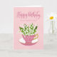 Uma pequena xícara de chá rosa e tênue cheia de um belo monte de lírios das flores do vale junto com as palavras que a mão escreveu Feliz Aniversário no topo da carta e as palavras que a mão escreveu 35 hoje com corações amorosos na xícara de chá. Um doce cartão de aniversário para sua tia fazendo 35 anos hoje!