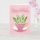 Uma pequena e tênue equipe rosa cheia de um belo monte de lírios das flores do vale junto com as palavras escritas manualmente Feliz Aniversário no topo da carta e as palavras 92 escritas hoje com corações amorosos na xícara de chá. Um doce cartão de aniversário para alguém especial virando 92 hoje!