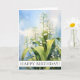 Belo design de aquarela das flores do vale, colocado em um cartão de aniversário de verão azul-claro.