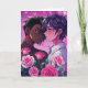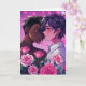 Lindo casal gay bi-racial de anime abraçado, cercado por corações e flores. Linda cartinha personalizada de Dia dos Namorados para o casal que ama anime! Adicione sua foto e mude o texto na área de personalização.